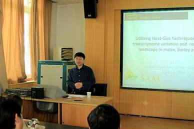 在校期间,李林博士还应邀为学院研究生和青年教师作了题为“Utilizing Next-Gen Techniques to explore transcriptome variation and recombination landscape in maize, barley and wheat”的学术报告。他对其在国外近期工作研究进展作了汇报。主要介绍了运用高通量深度测序手段所取得的研究成果。此次学术报告在玉米基础研究带来的新视野引起了参会师生的浓厚兴趣,现场互动热烈,部分研究生就感兴趣的热点问题和李林博士进行了深入交流。参会同学纷纷表示,此次报告会开阔了他们的视野,提高了他们的能力,受益匪浅。