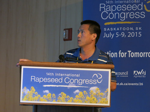 本次会议注册参会代表近900人,会议议题包括油菜基因组学、分子生物学、育种策略、植保、种子生产、营养成分、加工利用、气候胁迫、栽培与大田管理、经济政策与国际贸易等。参与形式有大会主题演讲、分组主题发言、分组发言、专题研讨会、墙报等。于澄宇副研究员分别进行了2次题为“Proteomic analysis of temperaturesensitive male sterility SP2S inrapeseed”及“Genetic classification and diversity of yellow-seeded rapeseed (Brassica napus L.) accessions”的分组发言。