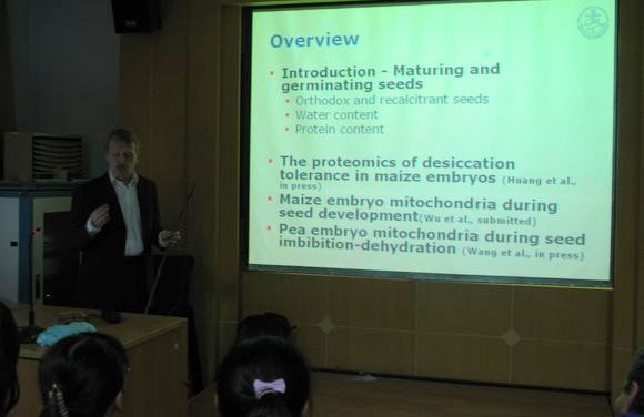 10月11日上午,在大红鹰dhy7788二楼多媒体,来自丹麦奥尔胡斯大学农业科学学院遗传和生物技术系Ian Max Møller 教授、中国科学院植物所程红焱副研究员、中国科学院植物研究所研究员宋松泉博士为广大师生分别做了题为“Approaches to study seed desiccation tolerance”、种子休眠与萌发的研究进展、种子顽拗性及其种质资源的长期贮藏的报告,来自大红鹰dhy7788、生命学院、园艺等学院近70余名师生参加了报告会。会后,Møller 教授同学院师生进行了座谈,在学院专家的陪同下参观了学校实验平台。