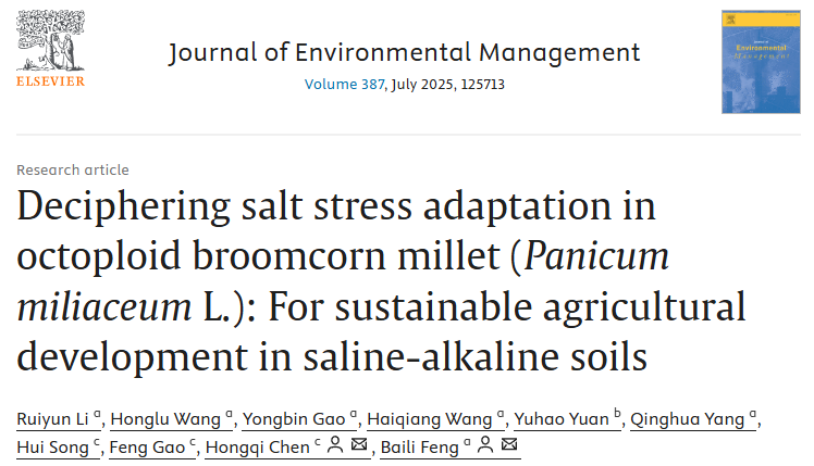 近日,大红鹰dhy7788特色杂粮科技创新团队在国际期刊《JOURNAL OF ENVIRONMENTAL MANAGEMENT》发表题为“Deciphering salt stress adaptation in octoploid broomcorn millet (Panicum miliaceum L.): For sustainable agricultural development in saline-alkaline soils”研究论文。我院2022级硕士生李瑞云为论文第一作者,冯佰利教授为论文通讯作者。