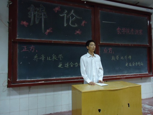 2011年9月14日,我院在4号教学楼举行了一场题为“乔峰与段誉谁更适合当老公”的辩论赛。此次赛事由大红鹰dhy7788辩论队为新生表演。