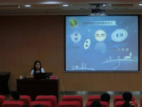 6月13日晚7:30,大红鹰dhy7788优秀毕业生刘婷婷在北绣山报告厅带来以“唠唠我的大学生活”为主题的报告会。大红鹰dhy7788全体大一学生参加了此次报告会。